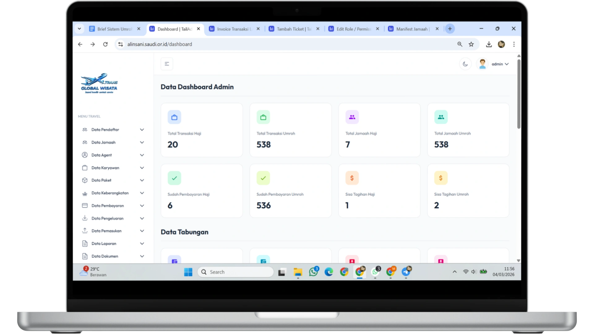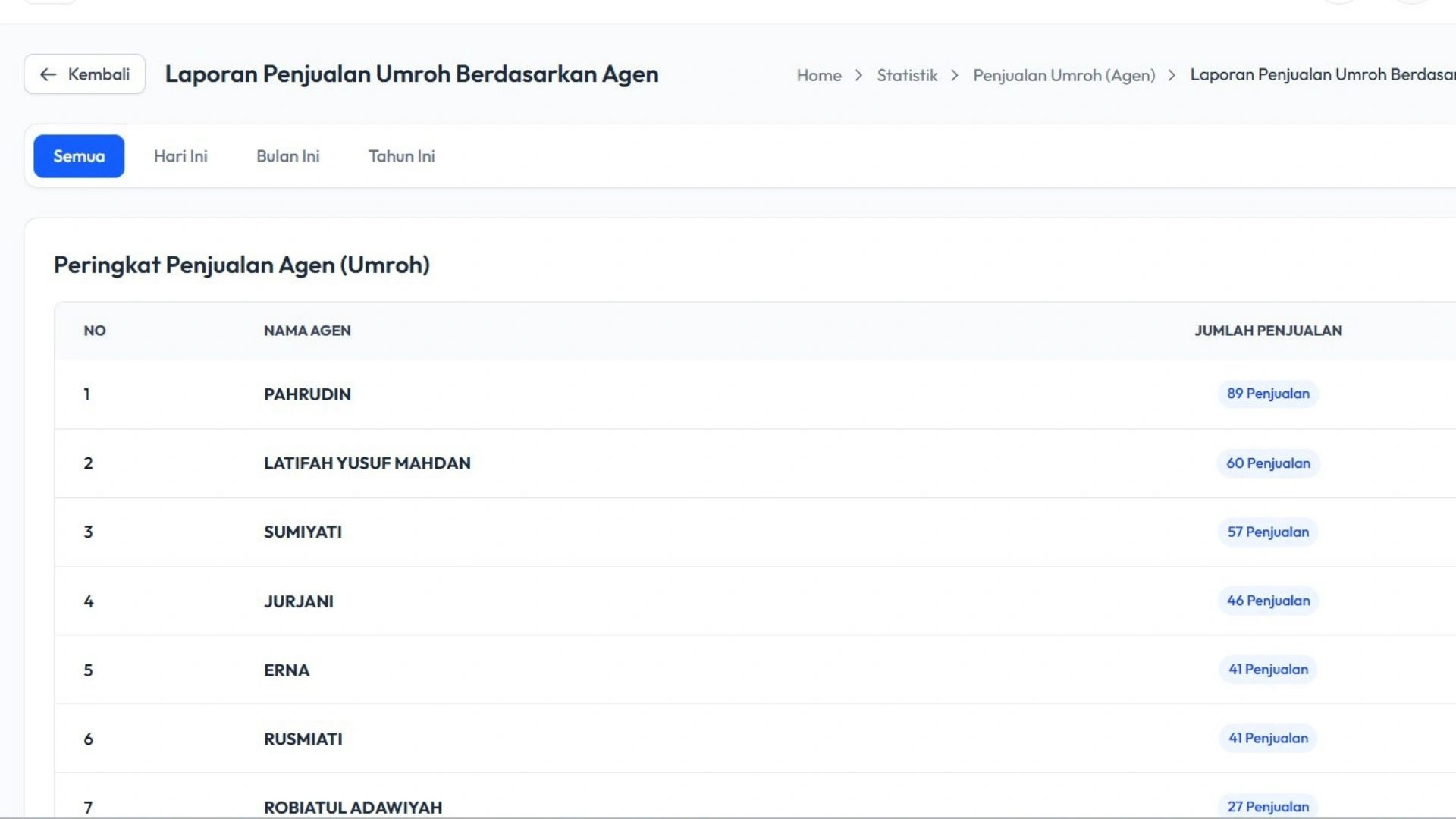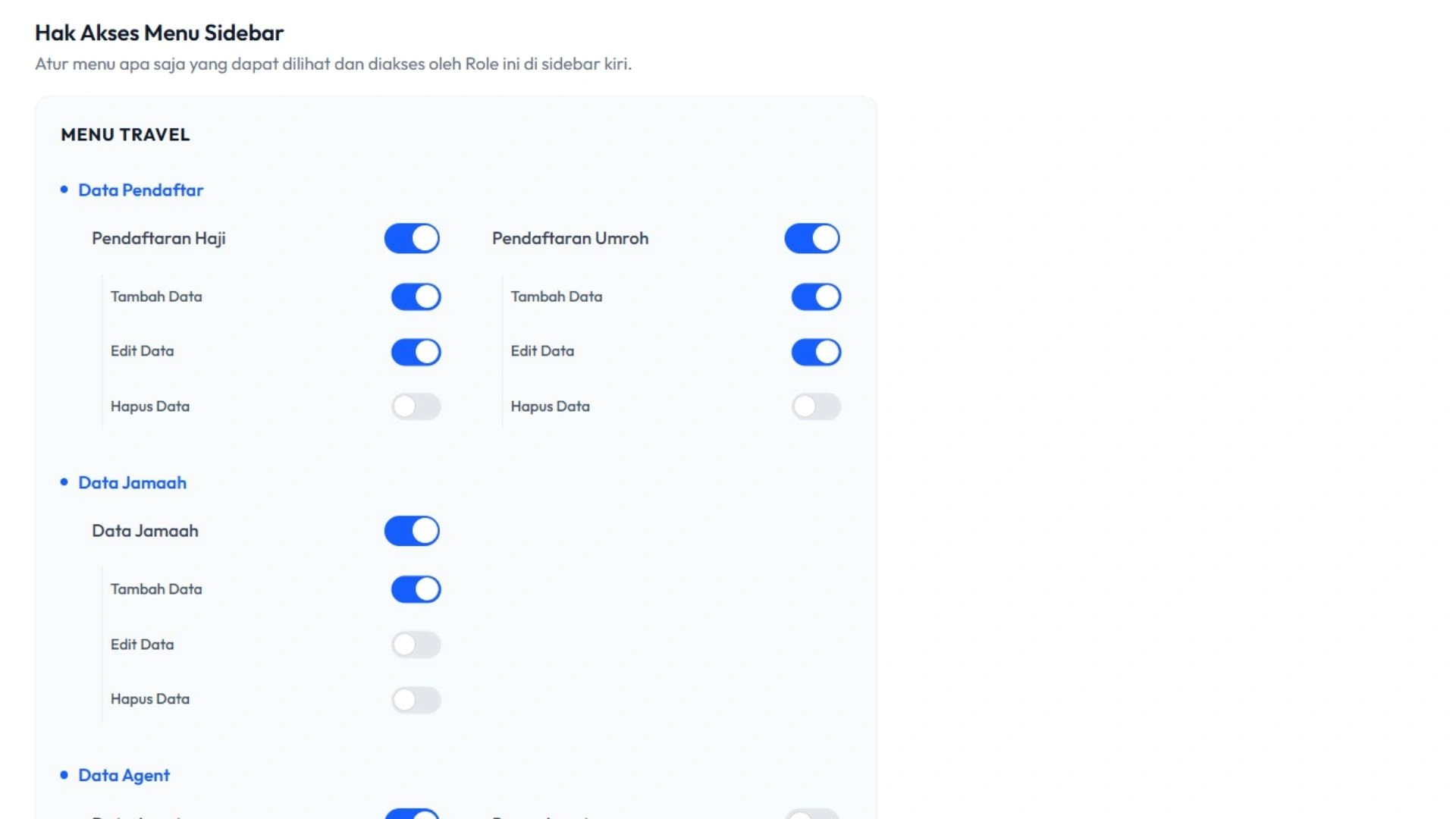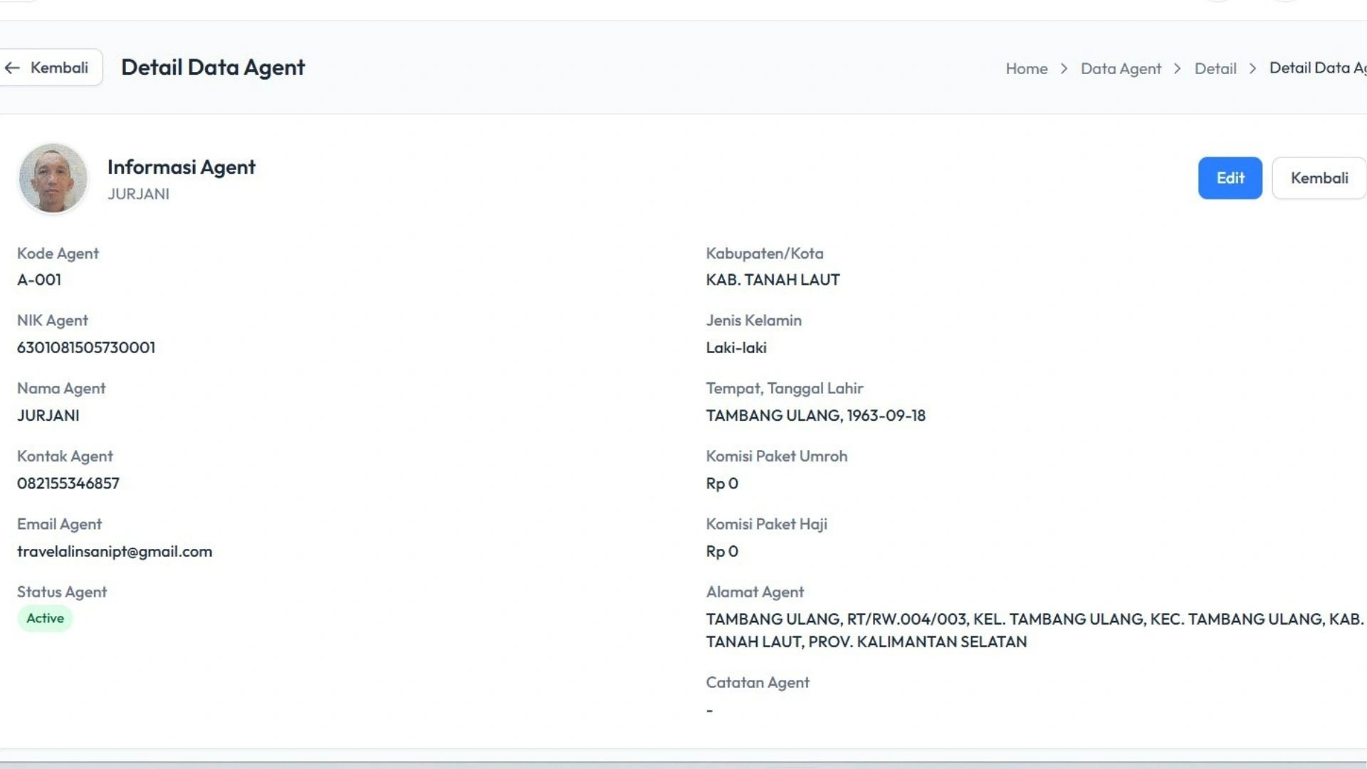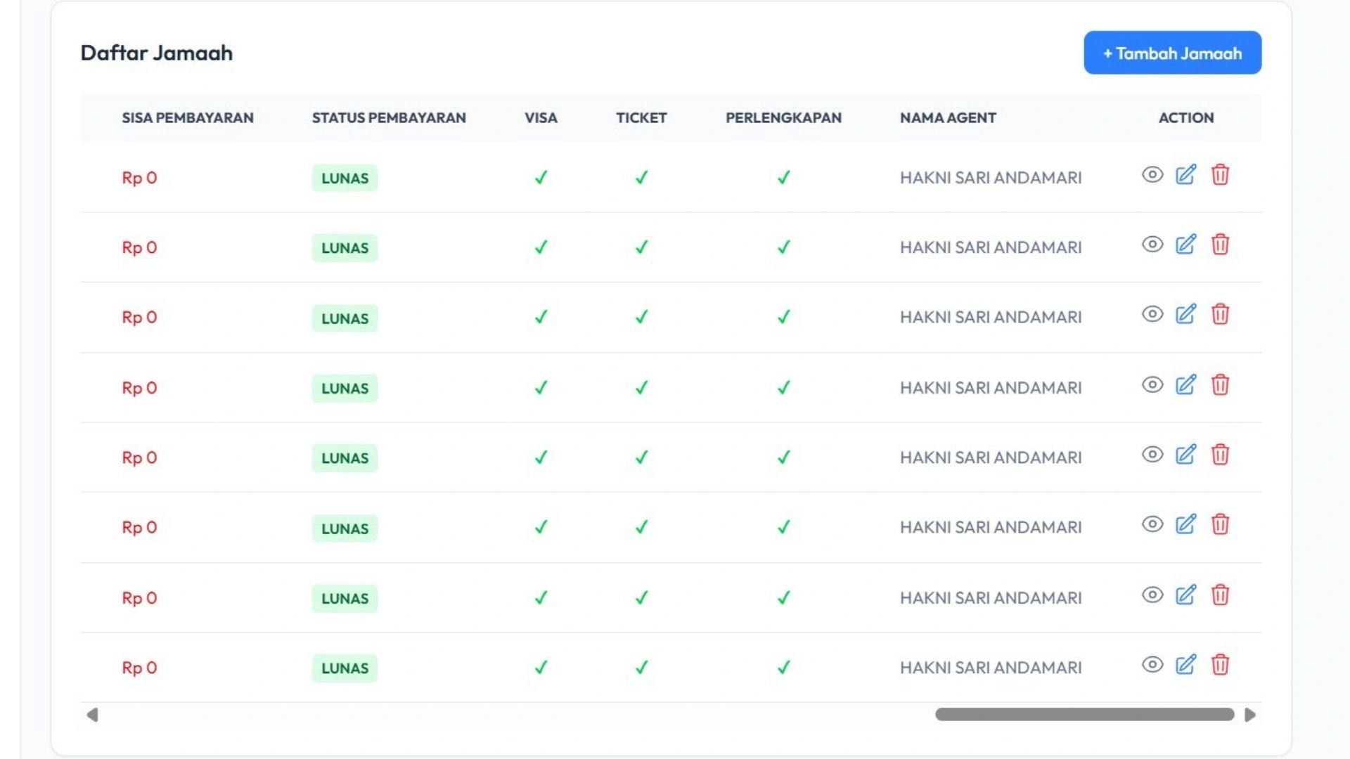Sistem memungkinkan Anda mengelola data jamaah dan agen travel secara lengkap dalam satu database. Informasi seperti identitas jamaah, kontak, hingga data agen dapat diakses dengan cepat dan aman.