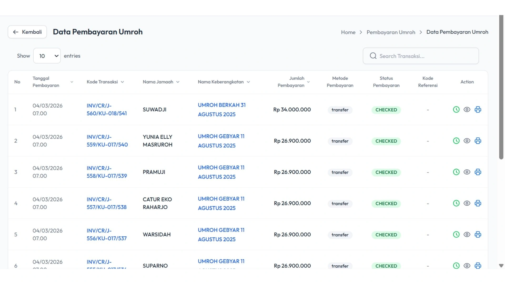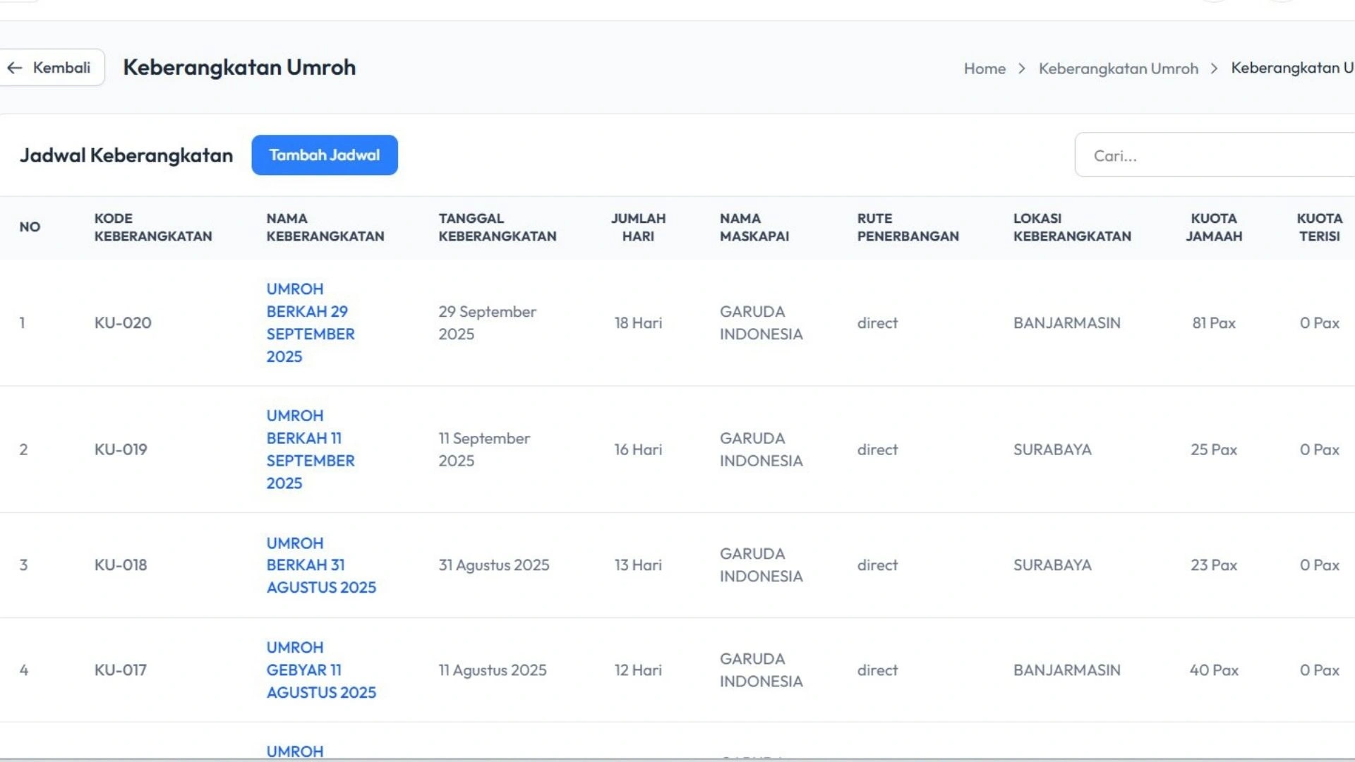 Sistem membantu Anda mengatur jadwal keberangkatan jamaah dengan lebih terorganisir. Semua data keberangkatan dapat dipantau dengan mudah sehingga meminimalkan kesalahan administrasi.