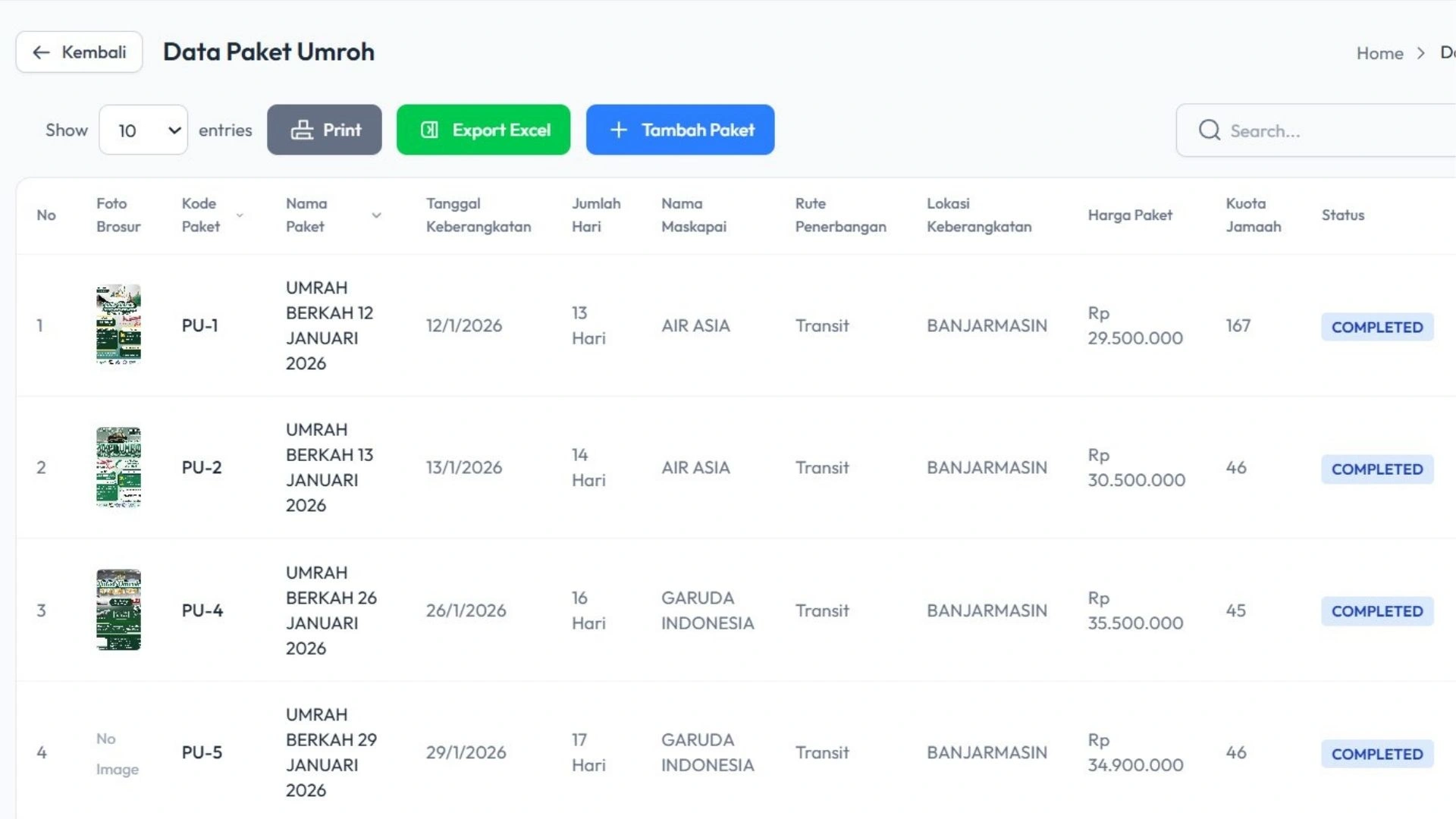 Buat dan kelola berbagai paket perjalanan umroh maupun haji dengan mudah. Anda dapat mengatur detail paket seperti harga, fasilitas, jadwal keberangkatan, dan berbagai informasi penting lainnya.