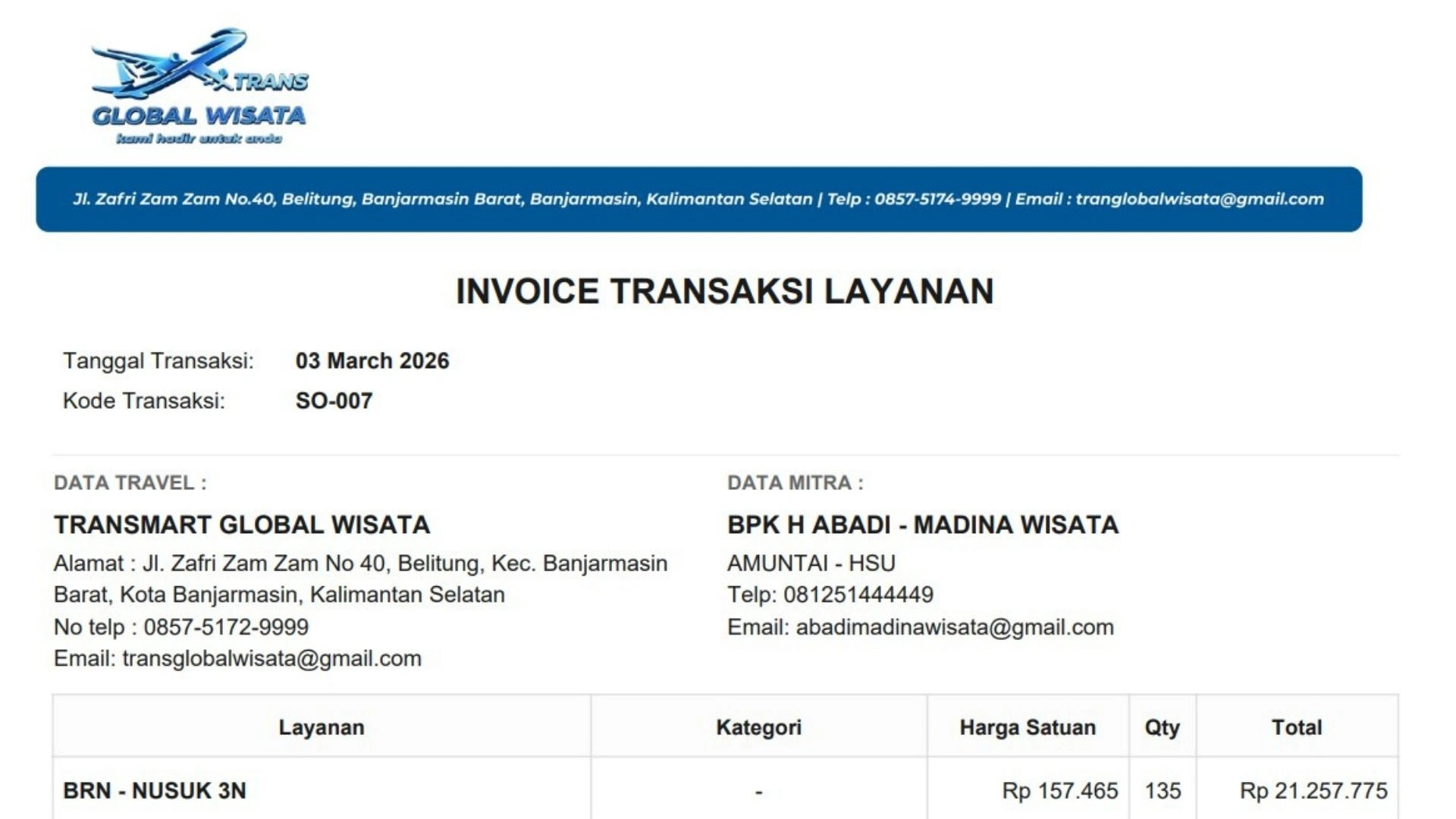 Setiap transaksi dalam sistem dapat menghasilkan invoice, kwitansi, dan dokumen yang siap dicetak sehingga memudahkan proses administrasi travel.