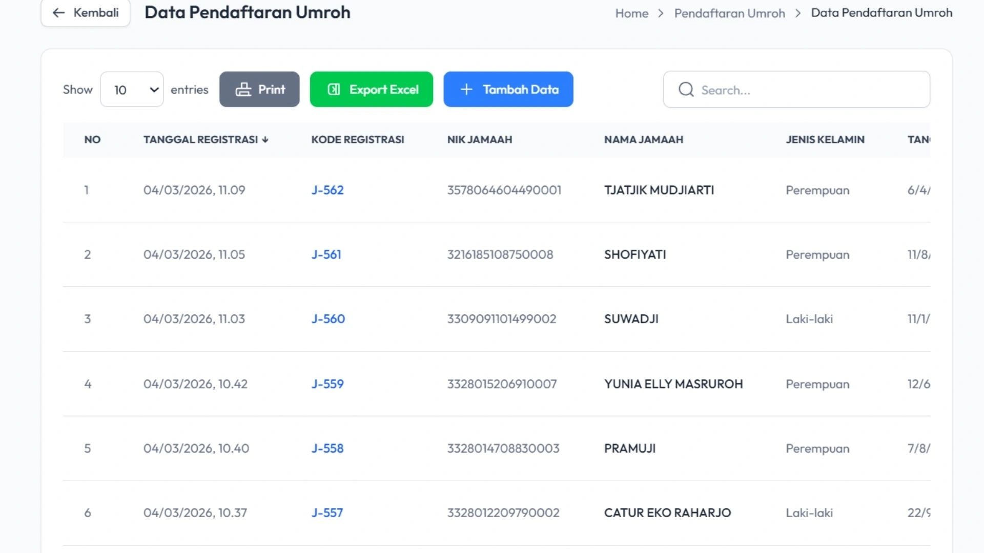 Kelola proses pendaftaran jamaah dengan lebih mudah melalui sistem yang terstruktur. Data pendaftaran jamaah dapat dicatat secara lengkap dan tersimpan rapi sehingga memudahkan proses administrasi travel Anda.